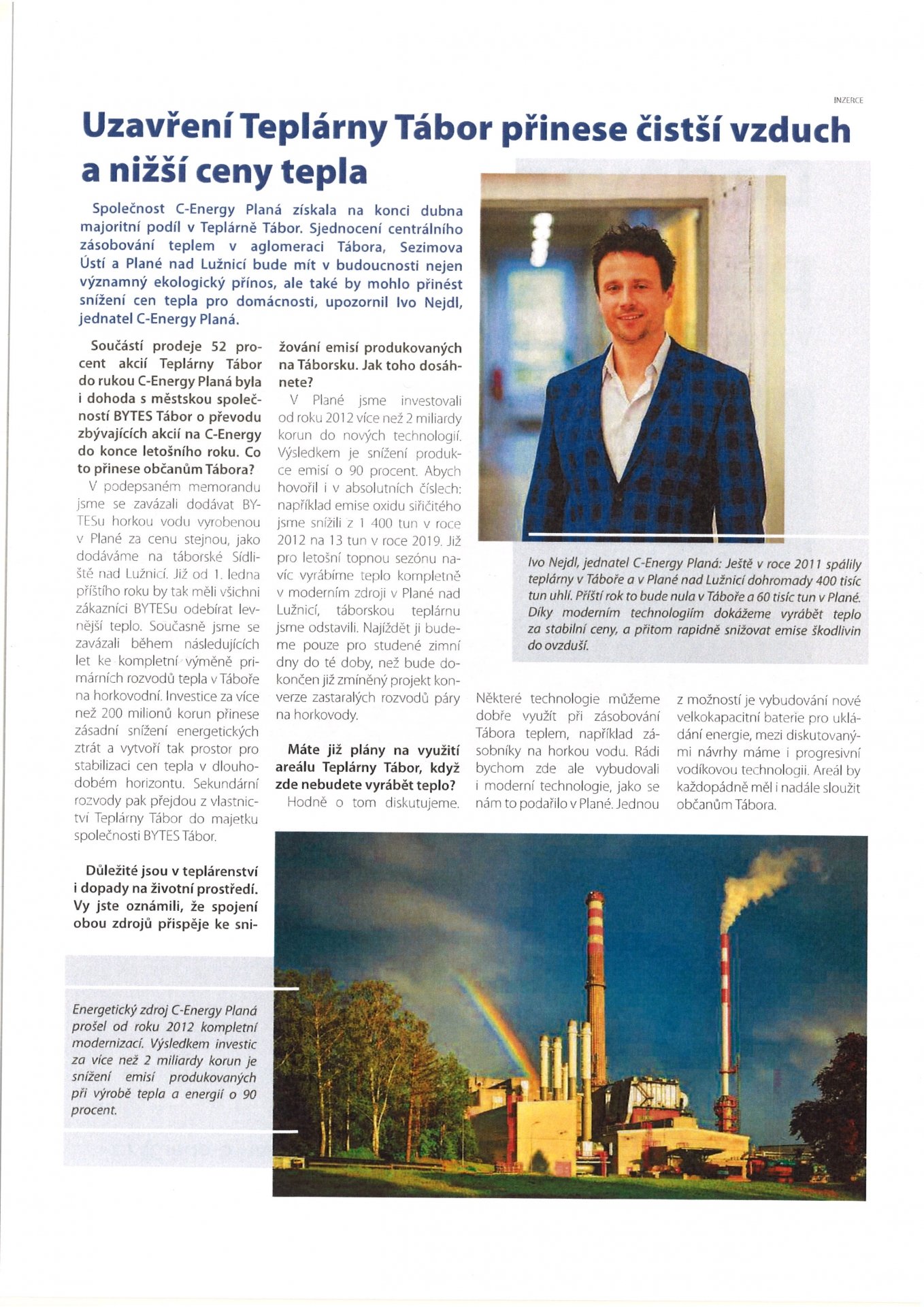 Dne 3.11. 2020 vyšel v příloze MF Dnes rozhovor s jednatelem C-Energy Planá o budoucnosti dodávek tepla v Táboře. Pan Nejdl v něm hovoří o dalších plánech společnosti C-Energy Planá po odkupu majoritního podílu v Teplárně Tábor.